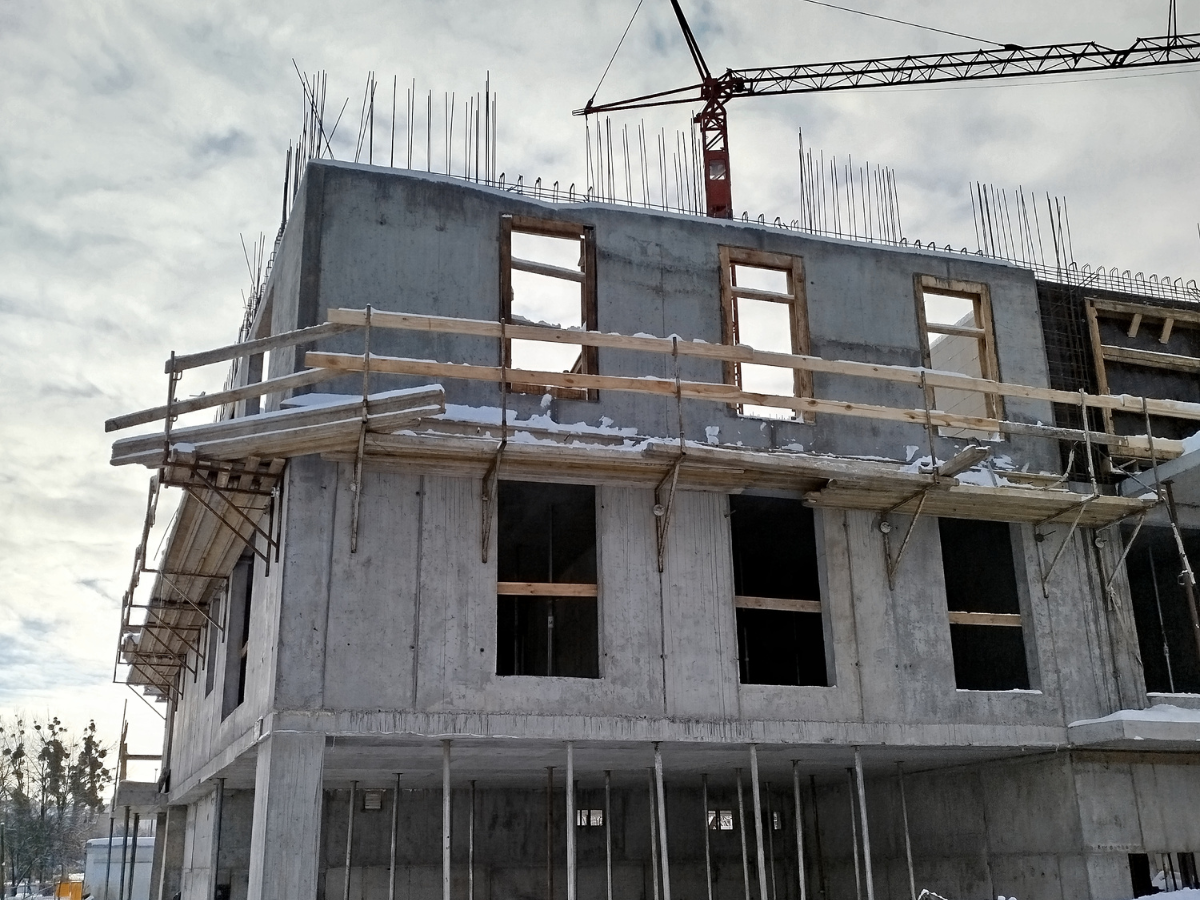 Zakończono betonowanie stropu nad pierwszym piętrem, co umożliwiło przejście do dalszych prac konstrukcyjnych. Obecnie prowadzone są roboty związane ze zbrojeniem oraz betonowaniem ścian drugiego piętra, dzięki czemu budynek stopniowo nabiera swojej docelowej formy.