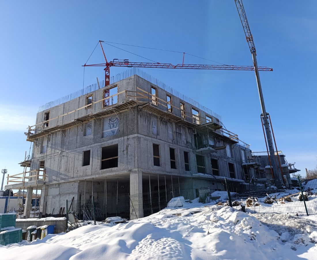Zakończono betonowanie całego stropu nad kondygnacją +2. Obecnie trwają intensywne prace na poziomie trzeciego piętra. Prowadzone jest zbrojenie oraz betonowanie ścian tej kondygnacji. To kolejny istotny krok w harmonogramie inwestycji, który przybliża nas do osiągnięcia docelowej wysokości budynku.