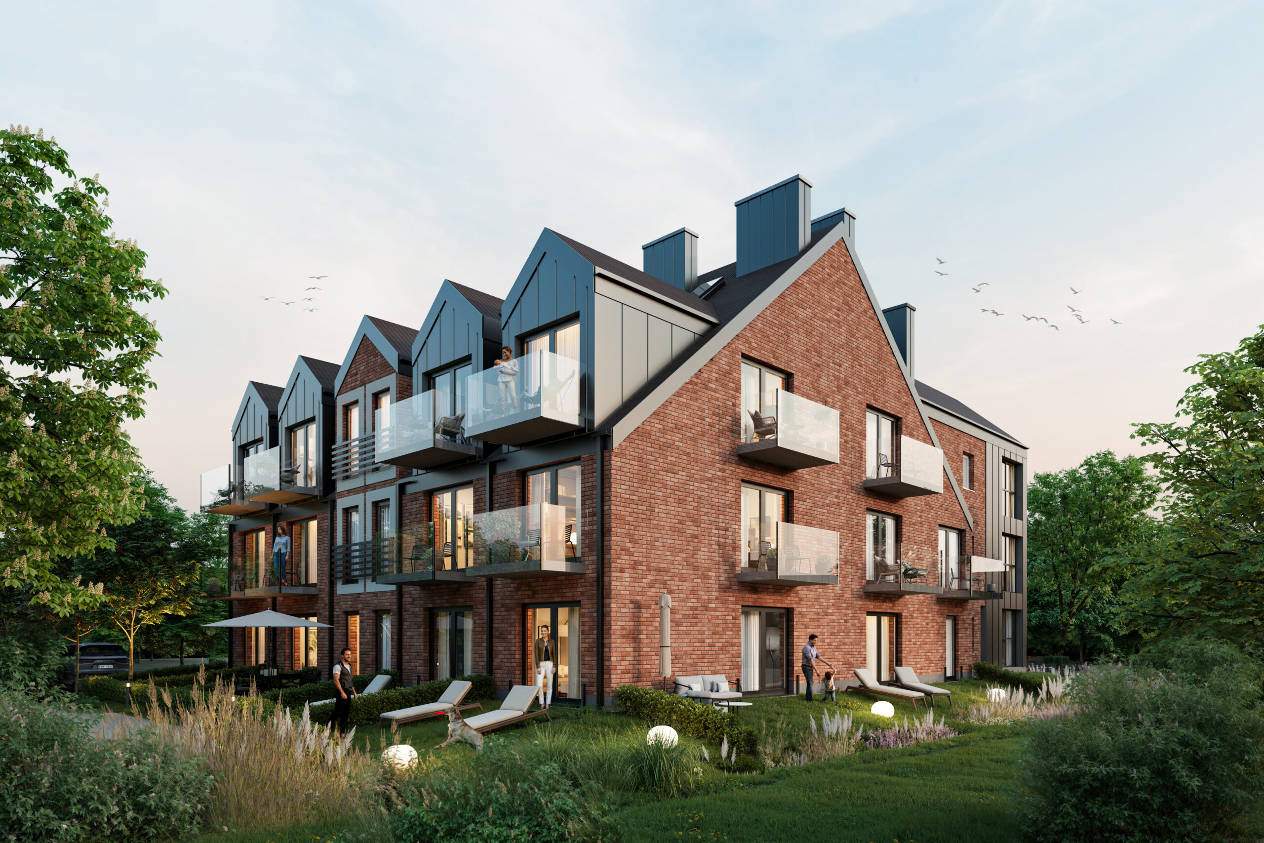 Architektura budynku będzie nawiązywać do nadmorskiego charakteru okolicy, łącząc ponadczasową cegłę z nowoczesnymi detalami i dużymi przeszkleniami. Charakterystyczne, spadziste dachy, przestronne balkony oraz prywatne ogródki na parterze nadadzą inwestycji elegancki i spójny charakter, harmonijnie wpisujący się w zielone otoczenie wyspy. Duże okna zapewnią doskonałe doświetlenie wnętrz oraz otworzą apartamenty na widok natury.