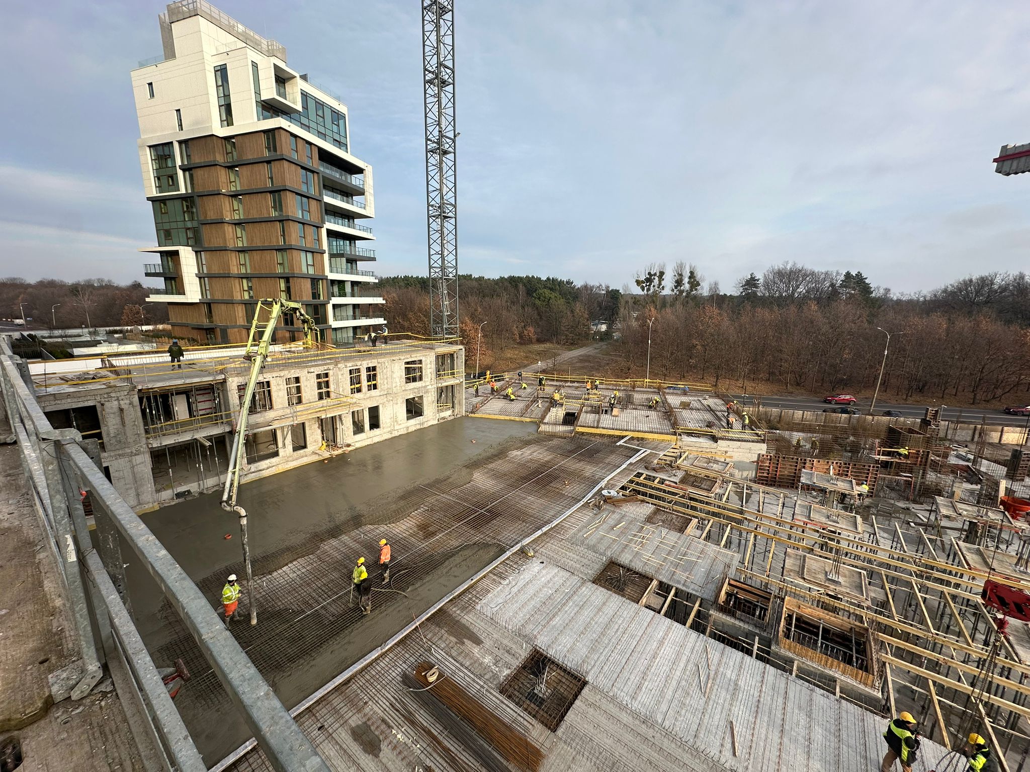 Obecnie kontynuowane są roboty stanu surowego. Prowadzone jest zbrojenie ścian na poziomie parteru w budynku C. Zalano część stropu nad poziomem -1, który docelowo stworzy eleganckie patio – zielone serce inwestycji, przeznaczone do wypoczynku i spotkań mieszkańców.