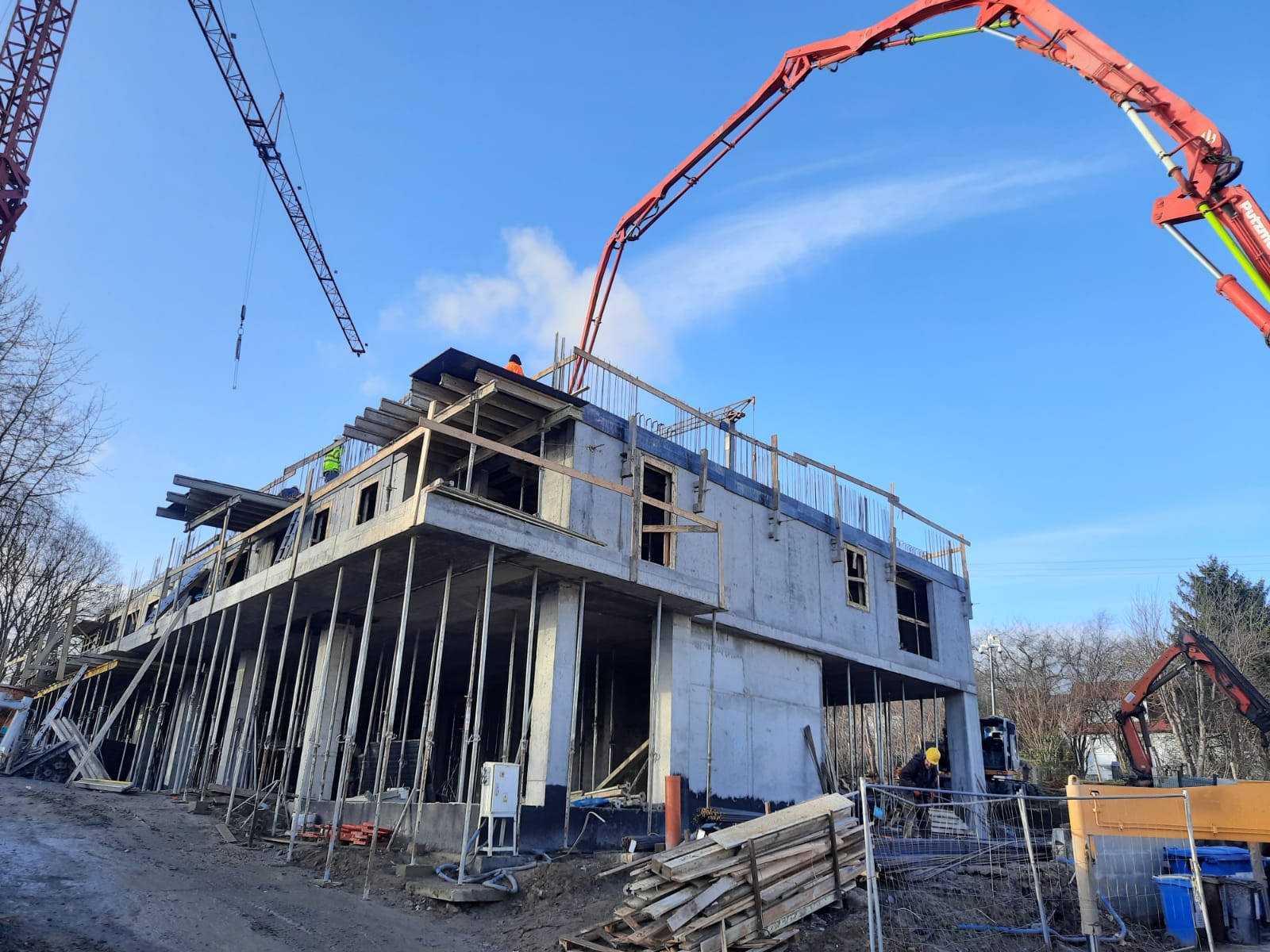 Obecnie realizowane jest betonowanie stropu nad pierwszym piętrem, co pozwala na dalsze kształtowanie bryły budynku. Dodatkowo, w celu usprawnienia realizacji kolejnych robót, na placu budowy zamontowano drugi dźwig, który znacząco zwiększy efektywność prac konstrukcyjnych.